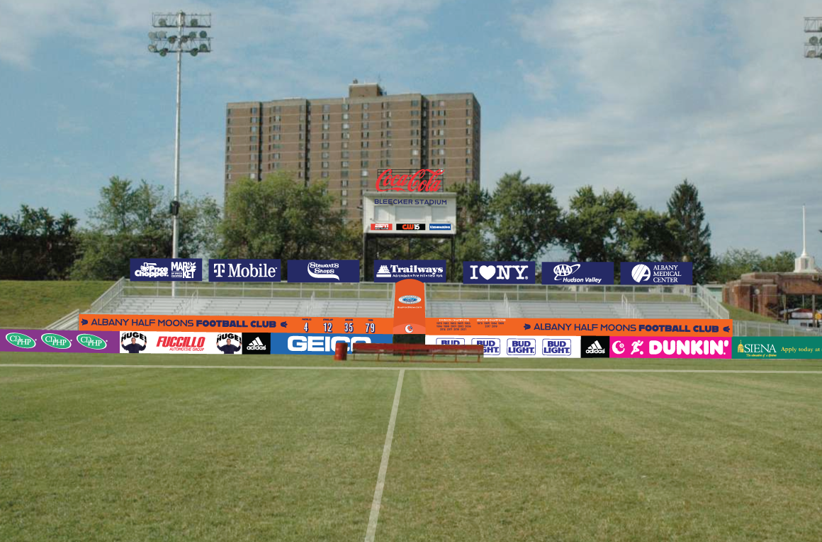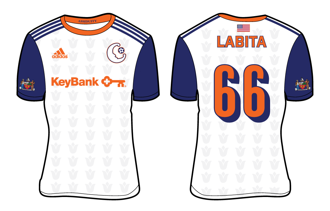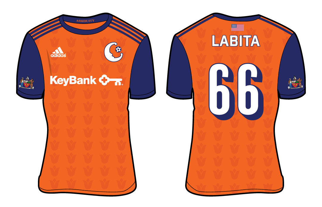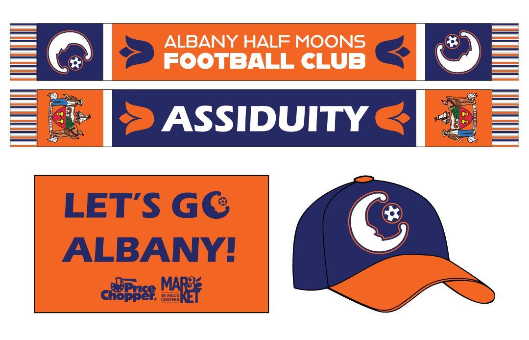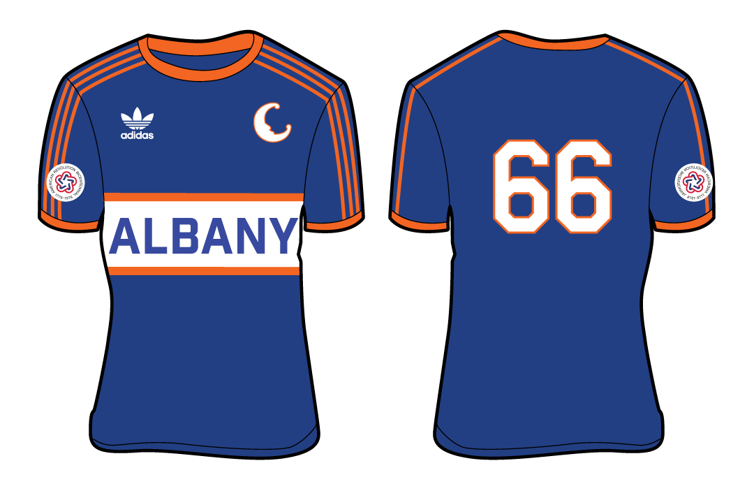 The Albany Half Moons are a concept for a soccer team in Albany, NY that plays at Bleecker Stadium. The team's name derives from the English name for the Dutch ship Halve Maen. The Half Moon is the ship that Henry Hudson sailed on when he ventured into present-day Albany in 1609. The orange and blue color scheme and subdued tulip pattern connect with Albany's Dutch heritage. The left sleeve features Albany's coat of arms. The team has a1970s throwback jersey featuring a retro Addidas logo and an American Bicentennial patch.