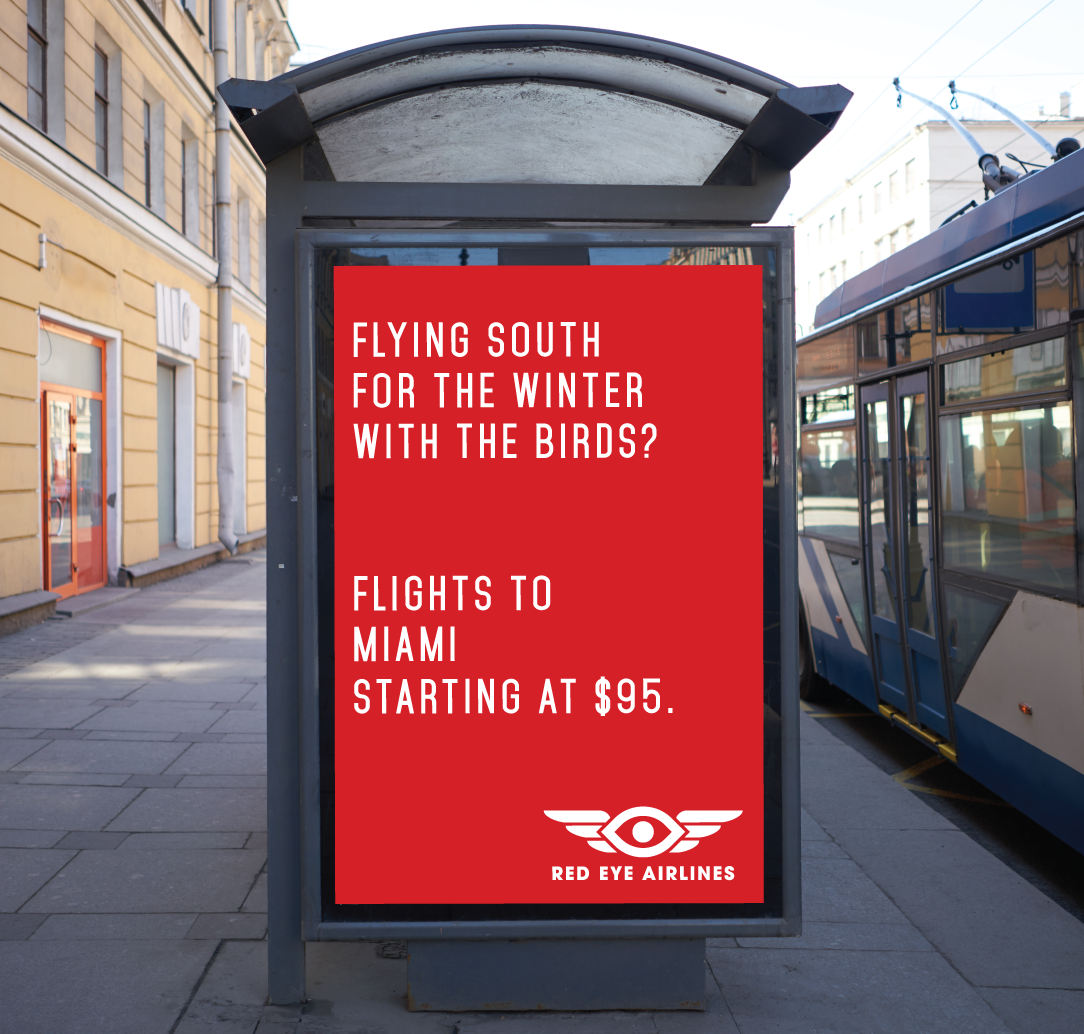 The name of Red Eye Airlines is inspired by the aviation term for late night/early morning flights. The goal of the logo was to create a simple design that could be easily recognized from the ground to the sky. Red Eye's logo drew inspiration from William Golden's iconic CBS logo.