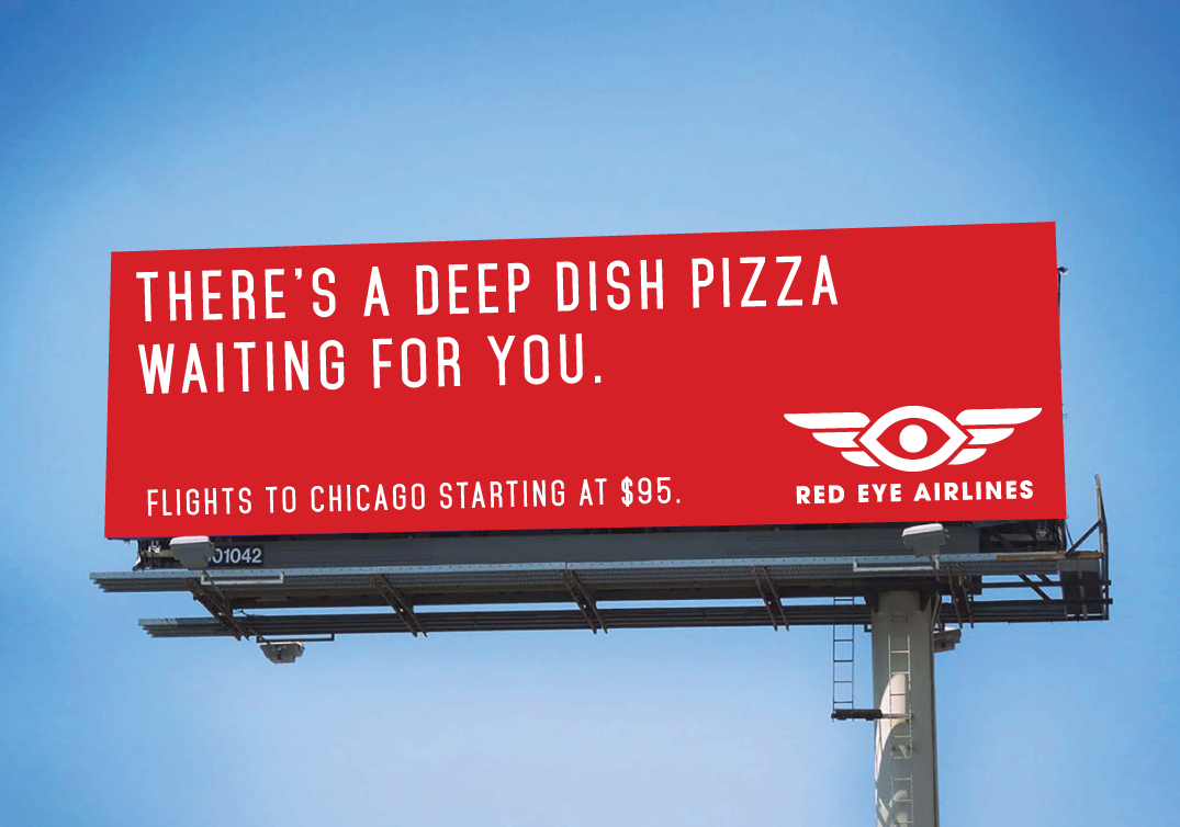 The name of Red Eye Airlines is inspired by the aviation term for late night/early morning flights. The goal of the logo was to create a simple design that could be easily recognized from the ground to the sky. Red Eye's logo drew inspiration from William Golden's iconic CBS logo.